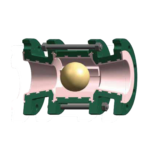 The whole body of the valve has PFA & FEP Teflon linings. RTFE ball moves freely on the Spacer where the lining has been done with Teflon materials and the ball stops in the double sided flange passageway. The pressure of the material of the counter flow moves the ball upstream stopping the flow. The spacer of the downstream is in development to ensure there is a free flow.